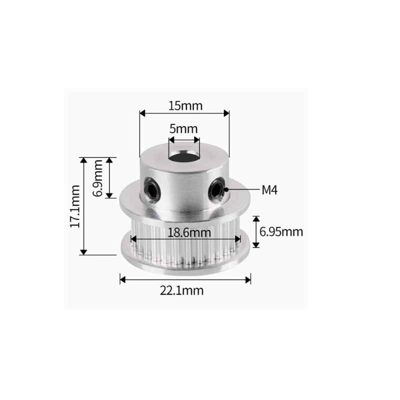Завдяки конструкції з 30 зубцями, шків забезпечує високу точність поїздки і мінімізує шанс пропуску кроків за умови правильної настройки. Діаметр отвору під вал 5мм робить шків сумісним з широким спектром моторів, включаючи багато стандартних NEMA 17 степперних моторів.